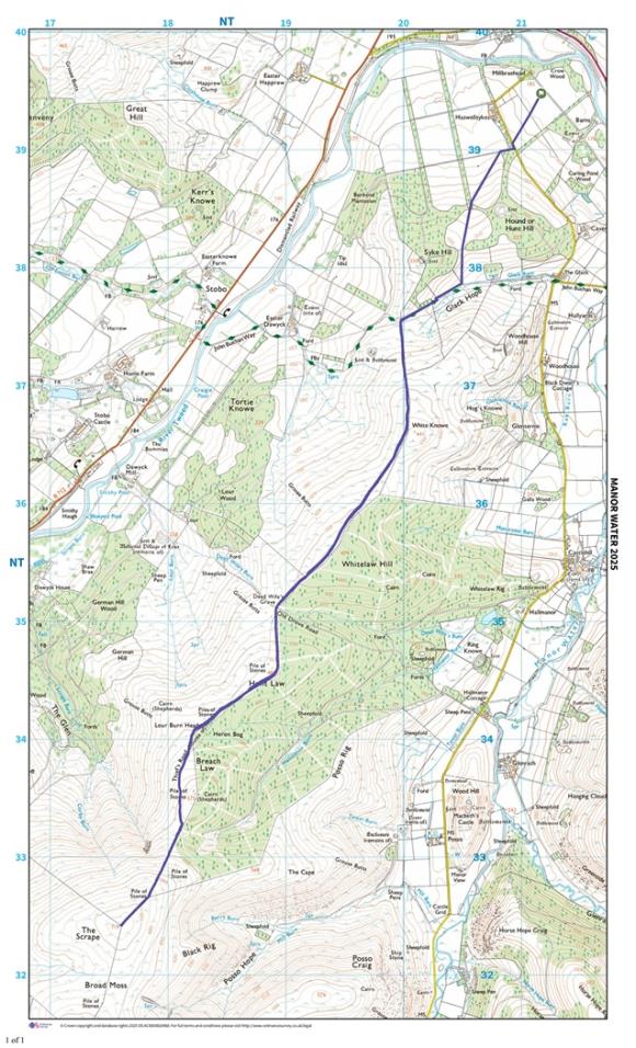 Depending on conditions the route may be marked at intervals, but self-navigation is required. The bad weather alternative course will follow the same route but the turning point, rather than being at the top of The Scrape hill, will be earlier and lower down the hill at NT181332. Any route changes will be made clear to runners before the start and a marshall will be at the new return location if applicable.